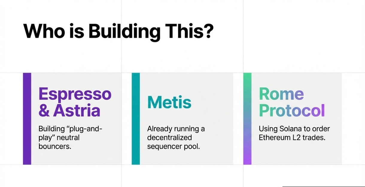 Sistemele Espresso & Astria: Acestea sunt cele mai mari nume care construiesc rețele de "Sequencer Partajat". Ei doresc să fie bouncers neutri plug-and-play pentru orice Layer 2 care dorește să se descentralizeze.
