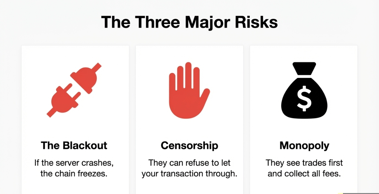 Problema este Centralizarea. În acest moment, pentru aproape fiecare Layer 2 major, există doar UN Sequencer, și este deținut în întregime de compania care a construit rețeaua.
