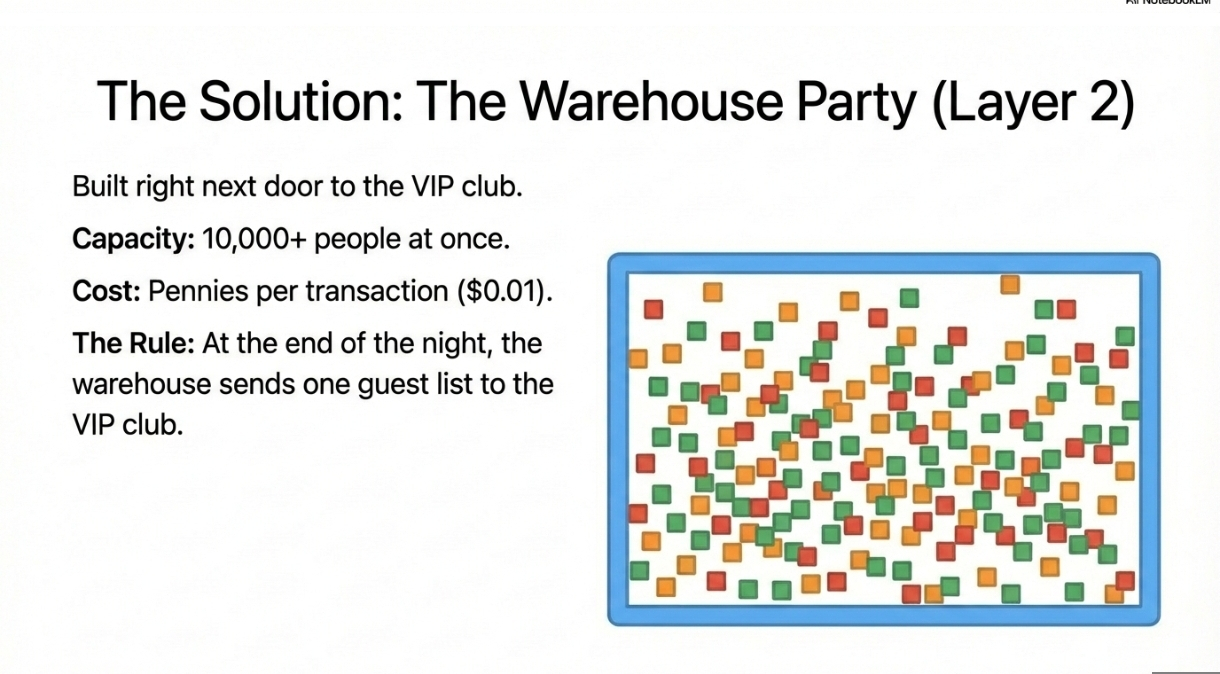 Gândește-te la Layer 2 ca la o petrecere masivă, sălbatică într-un depozit, chiar lângă clubul VIP. Prețurile băuturilor sunt mici (ca $0.01), iar există loc pentru 10.000 de oameni deodată.