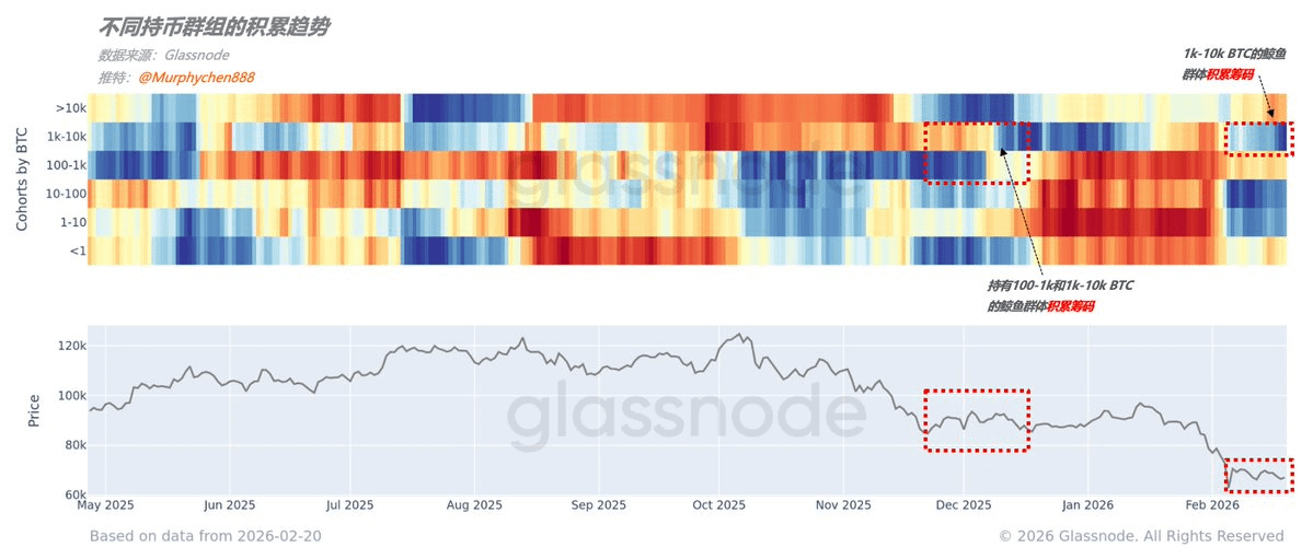 De asemenea, putem observa din comportamentul grupului de balene modificările corespunzătoare structurii de capital: când BTC a scăzut în intervalul 6-7w dolari, grupul de balene care deține între 1k și 1w BTC a început un proces de acumulare. Această situație a mai apărut și între decembrie 25 și ianuarie 26.