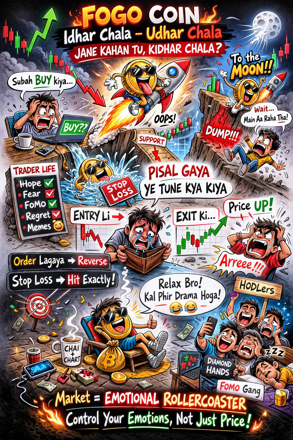Aaj ka market dekh ke lag raha hai Fogo coin ne gym join kar liya hai kabhi sprint, kabhi slip, kabhi flip. Trader bechara screen ke samne chai lekar baitha hota hai, aur price usko emotional roller coaster pe bitha deti hai. Ek candle green aati hai to dil bolta hai “bas ab upar hi upar,” doosri red aati hai to portfolio bolta hai “bhai main chalun kya?”