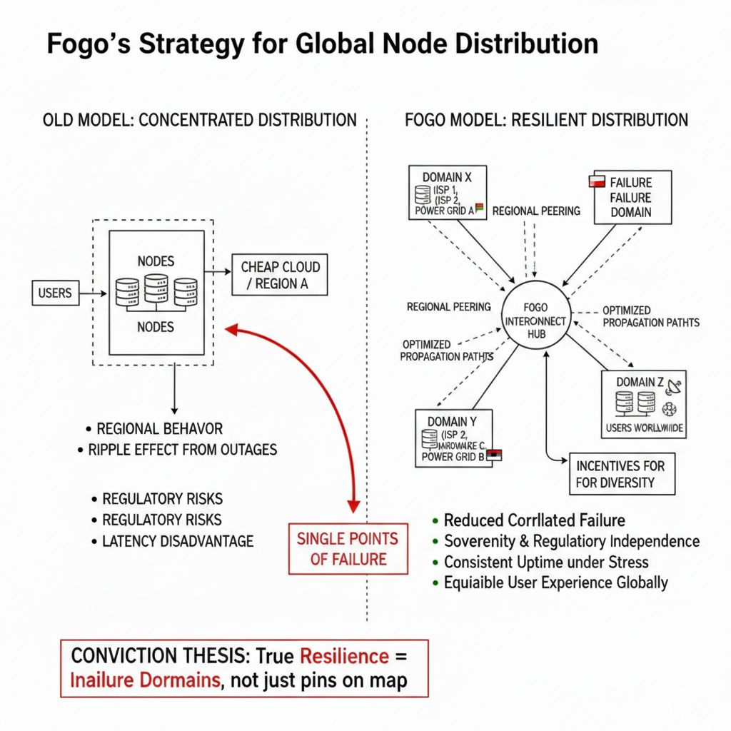 Fogo’s approach to global node distribution shifts the question from “where are nodes located?” to “how independent are their failure domains?” True resilience isn’t achieved by sprinkling nodes across continents. It comes from separating dependencies: different ISPs, power grids, legal regimes, hardware supply chains, and peering routes. Two validators in different countries but on the same cloud backbone are closer to each other, in risk terms, than two validators in the same city running on independent infrastructure.