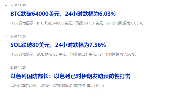 风险资产应声下跌:$BTC 跌破64000美元,日内跌3.5% ;$SOL 跌破80美元,24小时跌幅超8% ;