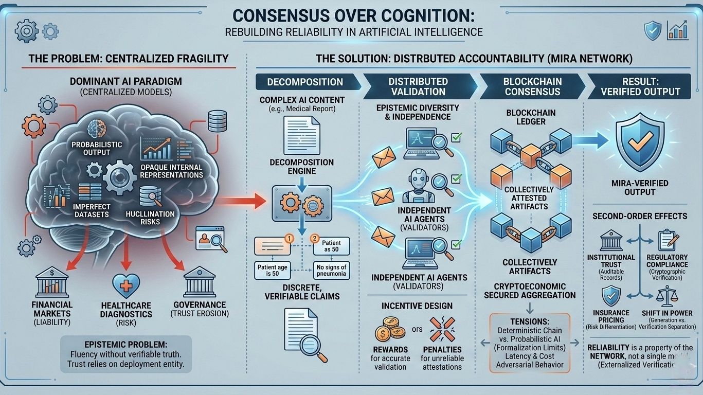 emerges within this context as an attempt to treat AI reliability as infrastructure rather than as a feature enhancement. Instead of accepting the output of a single model as an authoritative answer, the protocol decomposes complex AI-generated content into discrete, verifiable claims. These claims are then distributed across a network of independent AI systems, each tasked with validation. The aggregation of these validations is secured through blockchain consensus, transforming what would otherwise be a probabilistic statement into a collectively attested artifact. The shift is subtle but profound. Mira does not seek to improve the intelligence of any single model; it seeks to externalize verification into a cryptoeconomic system. Reliability becomes not a property of a model but a property of a network.