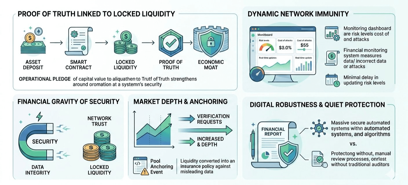 Locking assets as liquidity within a smart contract is no longer merely a yield-seeking strategy. It becomes an operational commitment — a pledge of capital that directly underwrites data integrity. In this framework, Proof of Truth is proportional to the volume of locked liquidity, forming an economic barrier that is costly to penetrate. I think of this as the “Financial Gravity of Security.” Each validation request subtly shifts market depth, and with every “Pool Anchoring Event” recorded in the logs, liquidity transforms into a living guarantee — an economic safeguard against misinformation.