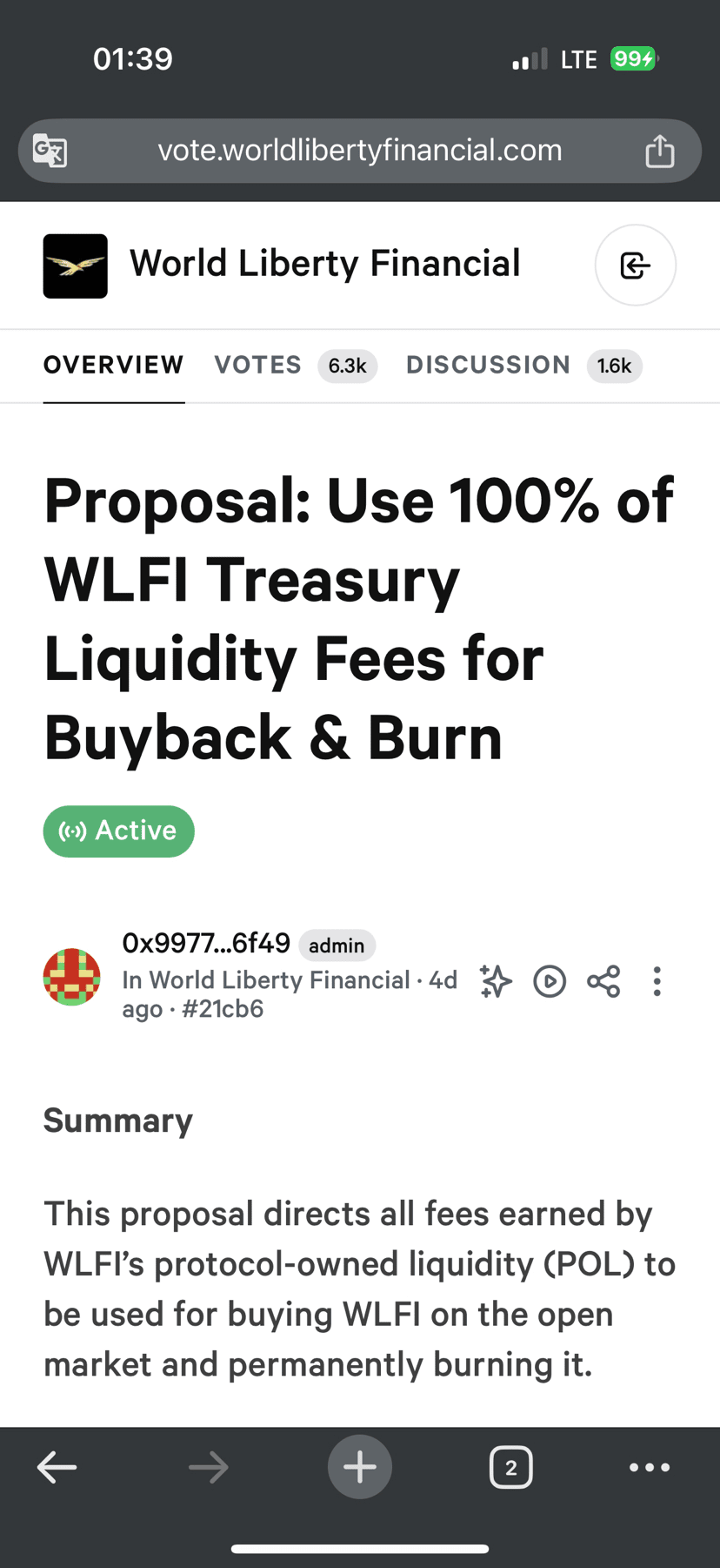 Această propunere direcționează toate comisioanele câștigate din lichiditatea deținută de protocolul WLFI (POL) pentru a fi folosite pentru a cumpăra WLFI pe piața deschisă și a-l arde permanent.