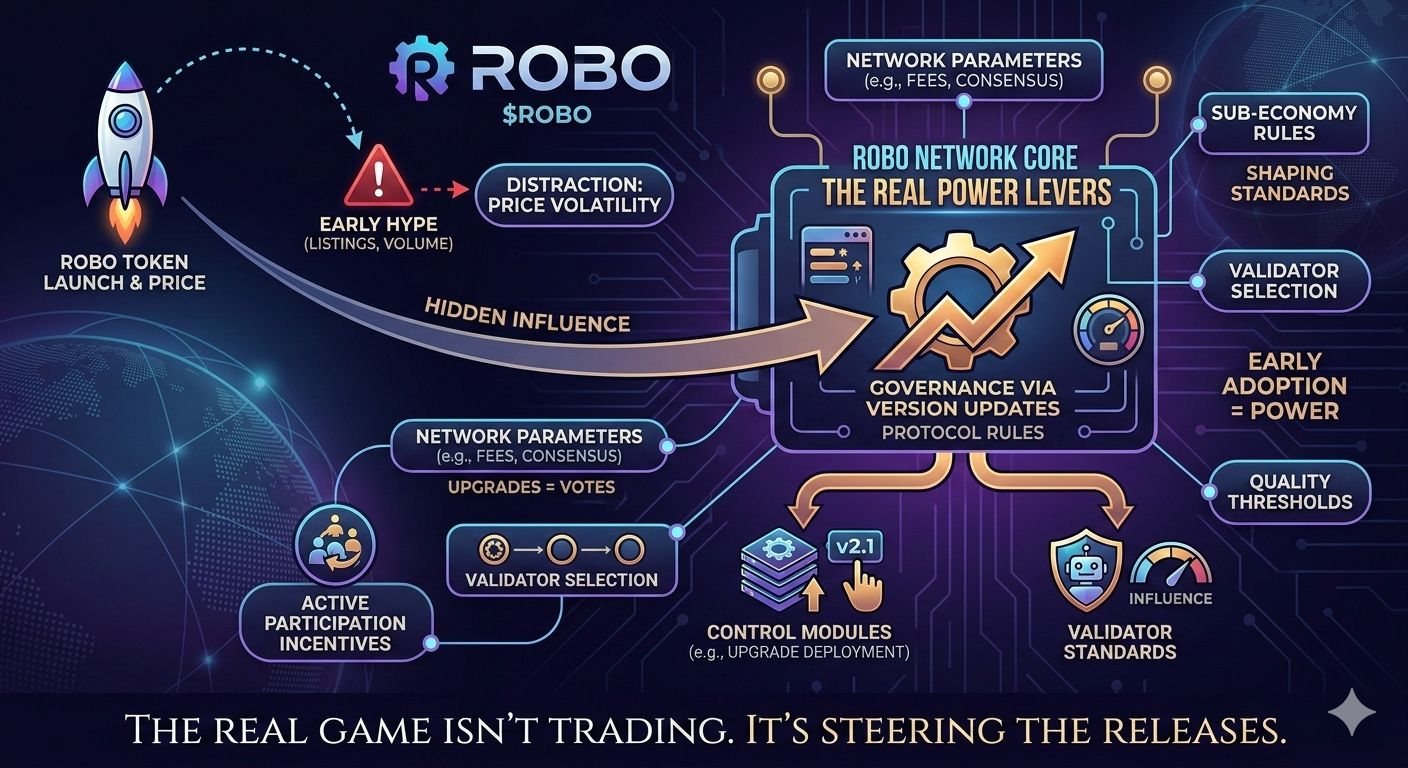 ROBO isn’t just about who holds tokens. It’s about who controls the levers that shape the robot economy: which modules get upgraded, which quality standards are enforced, which validators earn influence, and how network parameters propagate across users and sub-economies. Think of version control here as a form of governance disguised as software updates. Every decision about what becomes “standard” is a decision about real-world behavior.