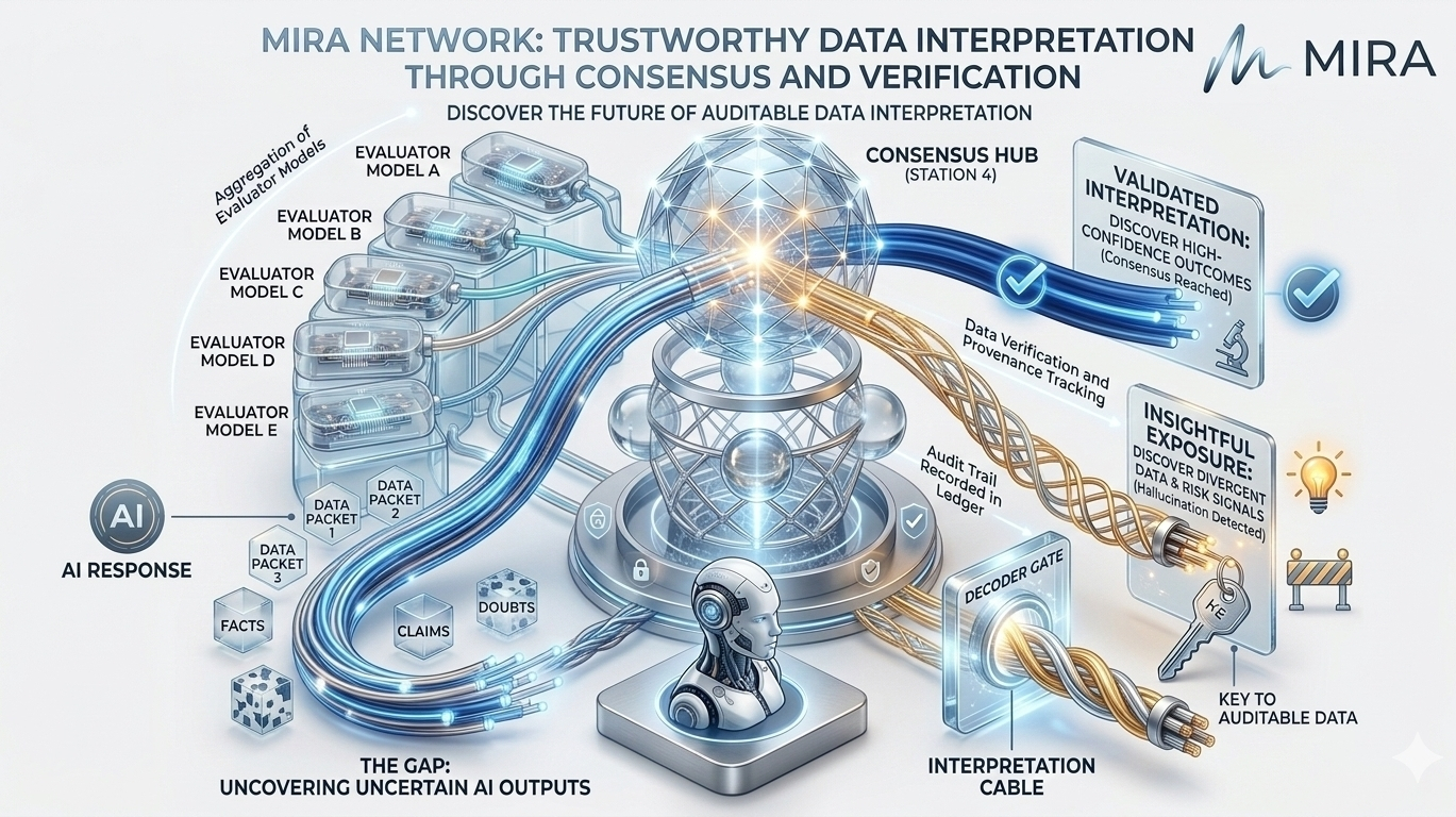 Aici este locul în care Mira Network introduce o abordare diferită. În loc să trateze un răspuns AI ca o singură bucată de output, sistemul îl descompune în afirmații mai mici care pot fi evaluate independent. Fiecare afirmație poate fi examinată în mai multe modele, permițând rețelei să compare interpretările în loc să se bazeze pe o singură sursă de raționament.