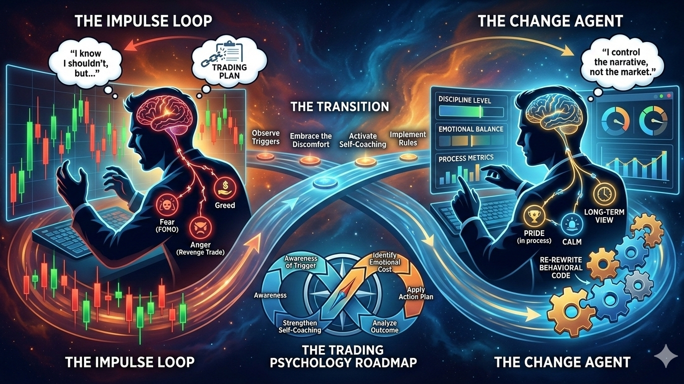 Pentru a fi un "Agent de Schimbare" în propriile tale tranzacții, trebuie să încetezi să fii o victimă pasivă a graficelor. Steenbarger susține că voința este o resursă limitată și, în cele din urmă, se epuizează. Schimbarea reală are loc atunci când creezi o experiență emoțională viscerală care face ca vechile tale obiceiuri rele să pară repulsive.
