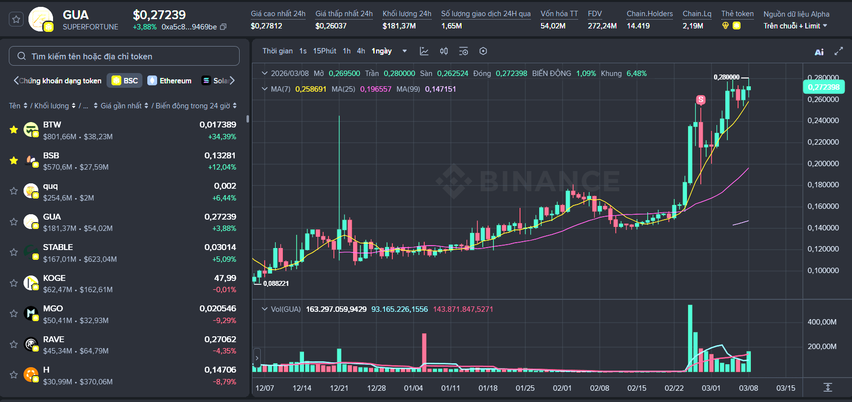 Giá hiện tại: GUA đang được giao dịch ở mức $0,27239, ghi nhận mức tăng trưởng 3,88% trong vòng 24 giờ qua.