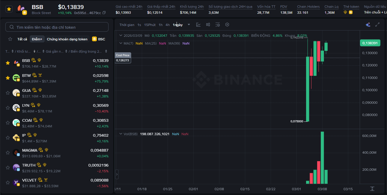 Sau đợt ra mắt đầy ấn tượng vào ngày 04/03/2026, Block Street (BSB) đang thu hút sự chú ý lớn từ cộng đồng nhà đầu tư khi duy trì được đà tăng trưởng ổn định trong một thị trường đầy biến động. Tính đến hôm nay, ngày 09/03, BSB đã đạt mức giá $0,13839, tiệm cận rất sát mốc đỉnh cao nhất (ATH) thiết lập trước đó.