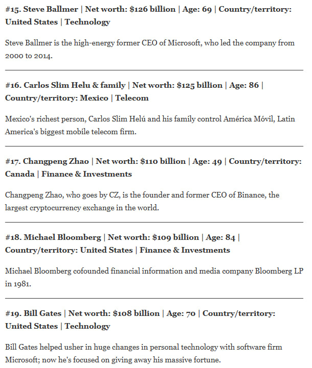 Pe poziția #18, se află Michael Bloomberg cu o avere de 109 miliarde de dolari. El a fondat Bloomberg LP în 1981, care acum este o sursă importantă de date și informații financiare pentru piețele globale.