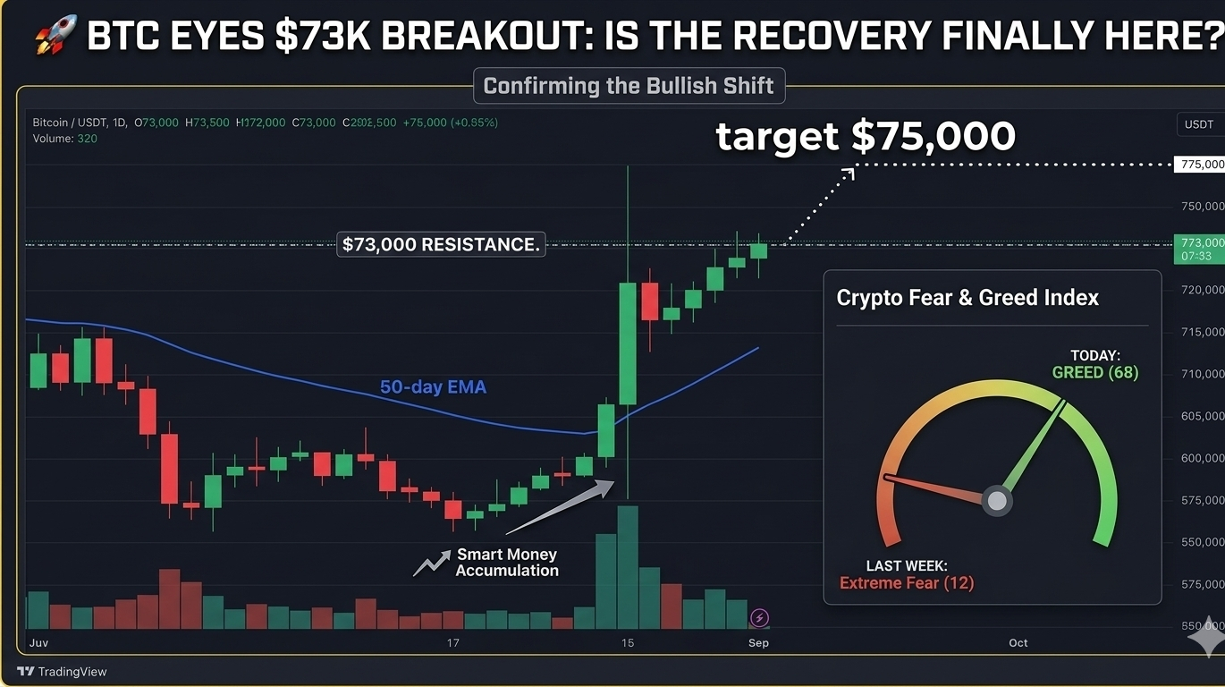 Piața arată semne timpurii ale unei recuperări puternice! $BTC se apropie în prezent de EMA-ul critic de 50 de zile la $73,000. Dacă vom obține o închidere fermă deasupra acestui nivel, am putea vedea o raliu masiv către noi maxime. 📈