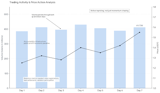 The other thing I keep thinking about is retention. Fabric Foundation's roadmap for 2026 moves from identity, task settlement, and structured data collection in early 2026 toward verified task execution, broader data submission, repeated usage, and larger data pipelines later in the year. That sequencing tells me the team understands that one successful robot action is not the asset. The retained record of repeatable, validated actions is the asset. But retained records only matter if they accumulate at scale, and right now I don't have the onchain metrics that would let me verify whether robots are actually registering identities on Fabric Protocol, whether tasks are settling through the verification layer, whether validators are participating beyond initial setup, or whether the x402 protocol integration with Circle is processing meaningful USDC transaction volume for autonomous payments. Without those numbers, I'm left interpreting volume and price action, which is a weaker signal than I want for a token positioning itself as critical infrastructure.