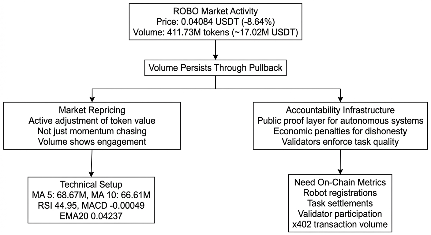 For now, I'm watching ROBO like a trader, not a fan. The token pulled back today, the technical setup is testing support, and the project is still early enough that most of the thesis remains unproven. But the question Fabric Foundation is asking, how do you price trust when the machine gets it wrong, is the right question for autonomous systems at scale. The answer they're building, a public proof layer with economic penalties for dishonesty and governance over quality thresholds, is architecturally sound. Whether they can execute it fast enough to justify current valuation before supply pressure hits, that's the trade. Track whether accountability mechanisms actually get used, whether retained proof accumulates onchain, and whether participants keep showing up after the launch excitement fades. That's where the real signal lives.