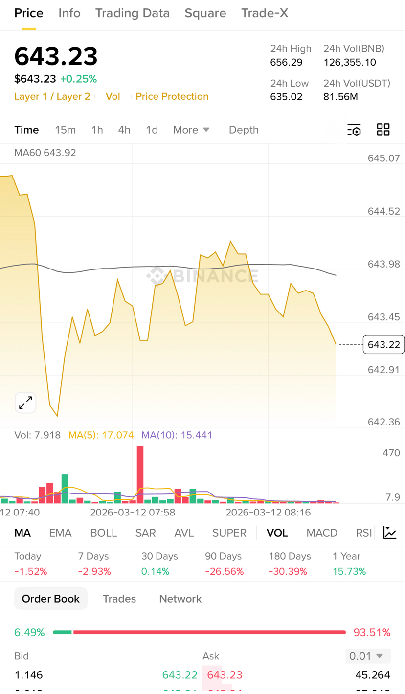 $BNB is currently trading around $643 against Tether, showing short-term consolidation after a recent pullback. The price briefly dipped near the $635 support zone and attempted a recovery, but momentum remains cautious as the market trades slightly below the short-term moving average. Volume activity suggests that traders are waiting for a clearer direction before committing to large positions. The $640 area is acting as an immediate support, while resistance is forming around $650–$656, which was the recent 24-hour high.