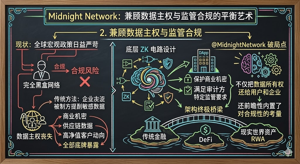 目前全球宏观政策对加密市场的监管日益严苛,完全黑盒的网络极易面临合规风险。@MidnightNetwork 的破局点在于,它不仅把数据所有权还给用户和企业,还前瞻性地内置了对合规性的考量。