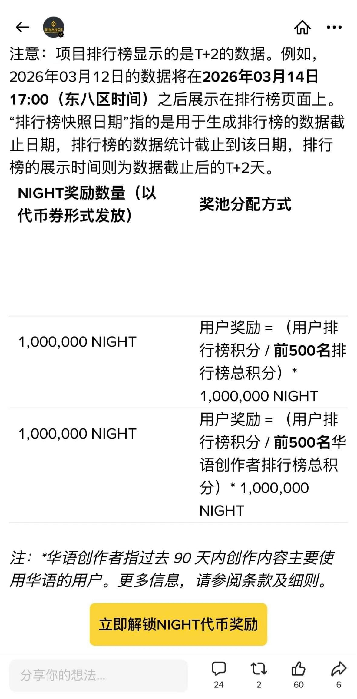 之前那波写 ROBO 的任务,群里一堆人抱怨说太卷了,包括我在内,毕竟只给前100名发奖,很多人写了半天连个安慰奖都拿不到,我辛辛苦苦写了一两天结果排名就500名之后,好像更是到了两千多名。但今天广场创作者任务台新出的这个 @MidnightNetwork 羊毛。这次名额直接干到了前 500 名!一起瓜分 100万个 $NIGHT ,500名努努力加油干。