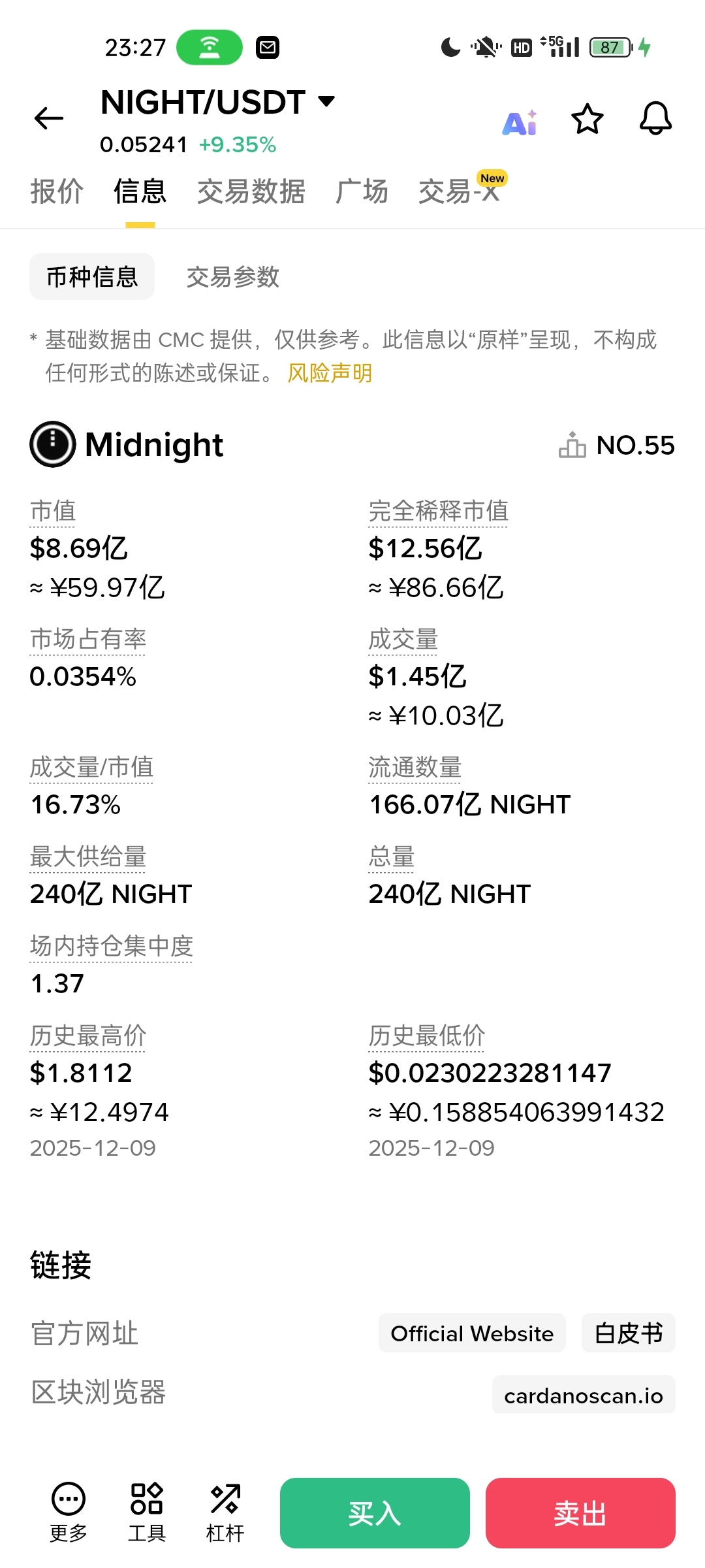 Ceea ce înseamnă este că volumul de tranzacționare a crescut, de la 10 milioane de dolari la 126 milioane. Ce înseamnă asta? Înseamnă că fonduri mari au început să intre pe piață. La acest nivel de preț, cred că spațiul de scădere poate fi limitat, pentru că dacă scade din nou, va reveni la nivelurile de dinainte de listarea pe Binance, și atunci semnificația listării pe Binance va dispărea, dar potențialul de creștere depinde totul de ceea ce poate face Midnight după ce lansează rețeaua principală.