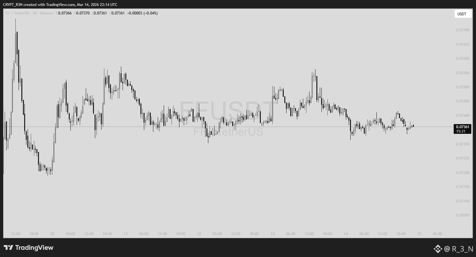 The FF token has been trading in a tight range between $0.0705 and $0.0770 over the past week, showing signs of consolidation after recent volatility. The current price sits at $0.07368 (+0.05%), reflecting cautious accumulation.