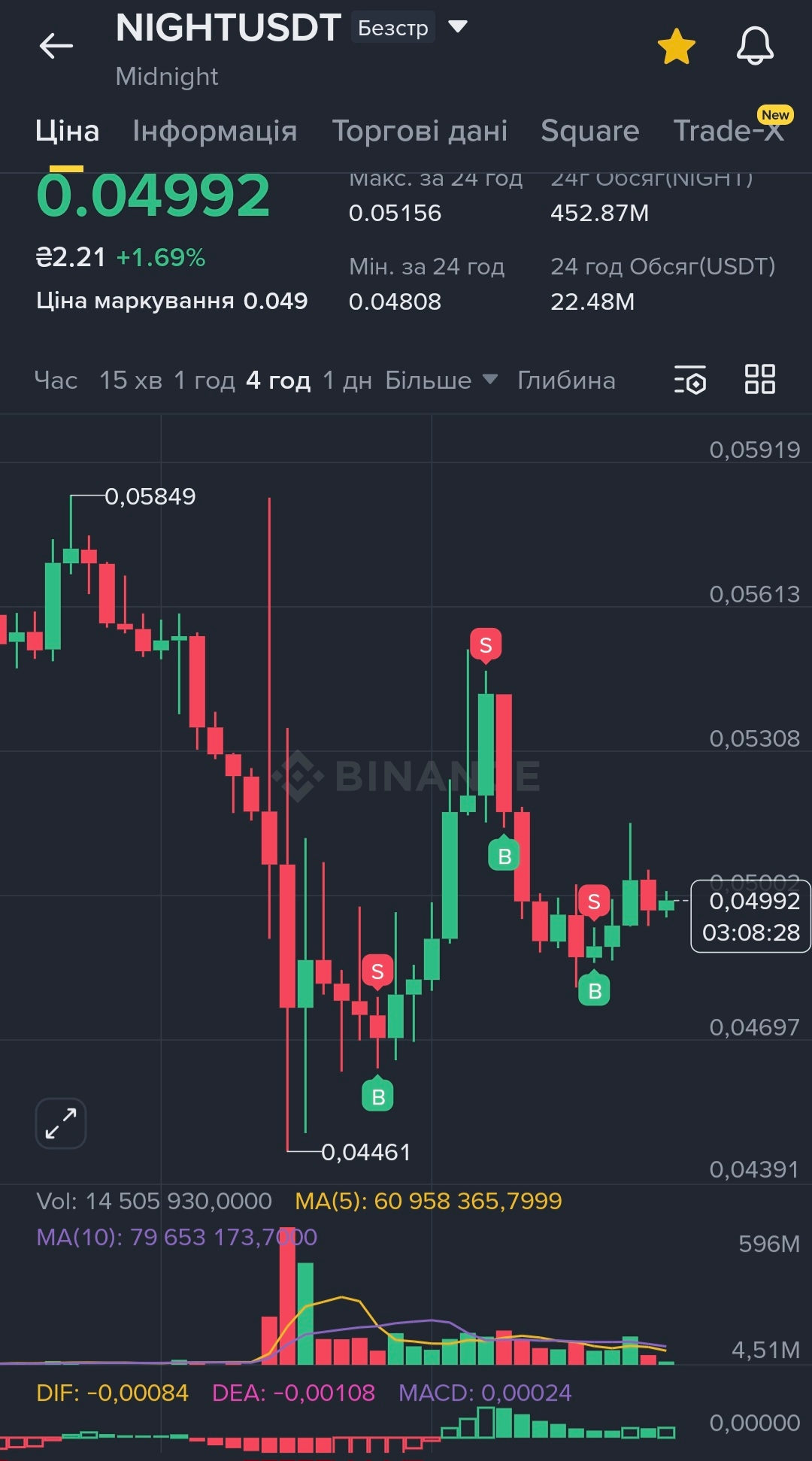Зараз ціна " залипає" до рівня $0.05.Я не чекаю легких іксів за одну ніч,але те як Midnigh відкуповують на просадках,додає впевненості.Головне - не жадібнічати.Поставив стоп трохи нижче локального лру і просто спостерігаю за грою.