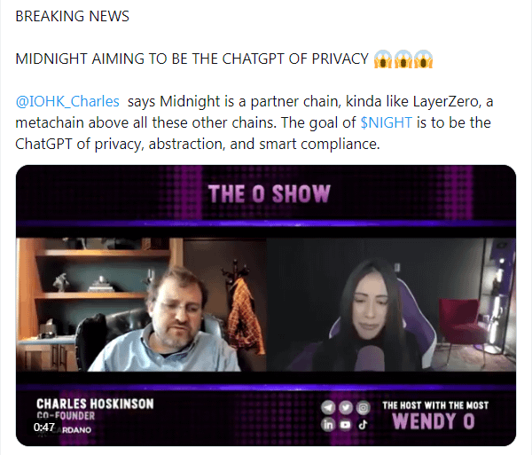 So sánh mà ông đưa ra cũng khá dễ hình dung: vai trò của Midnight trong hệ sinh thái có phần giống cách LayerZero đóng vai trò hạ tầng kết nối giữa các chain, nơi các network khác nhau có thể giao tiếp với nhau thông qua một lớp trung gian. Nhưng điều khiến mình chú ý hơn lại nằm ở cách ông mô tả mục tiêu dài hạn của dự án. Hoskinson từng nói rằng Midnight muốn trở thành “ChatGPT của privacy, abstraction và smart compliance.”