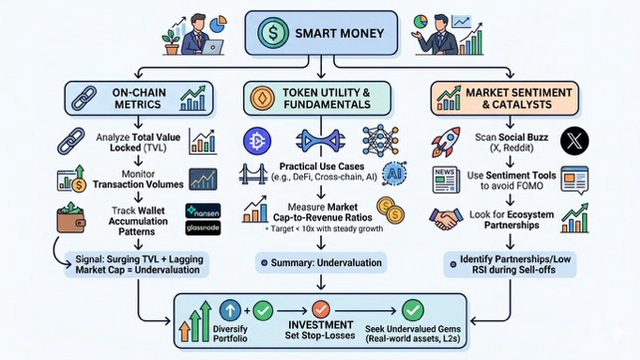 Let’s break down how they do it. First, on-chain activity is king. Smart money dives into metrics like Total Value Locked (TVL), transaction volumes, and wallet accumulation patterns using tools like Nansen or Glassnode. For instance, if a coin’s TVL is surging while its market cap lags, that’s a red flag for undervaluation—think projects with real revenue growth but low hype. I’ve seen this play out with tokens like Chainlink, where on-chain data showed whale buys during dips, signaling strong fundamentals in real-world asset (RWA) integration.