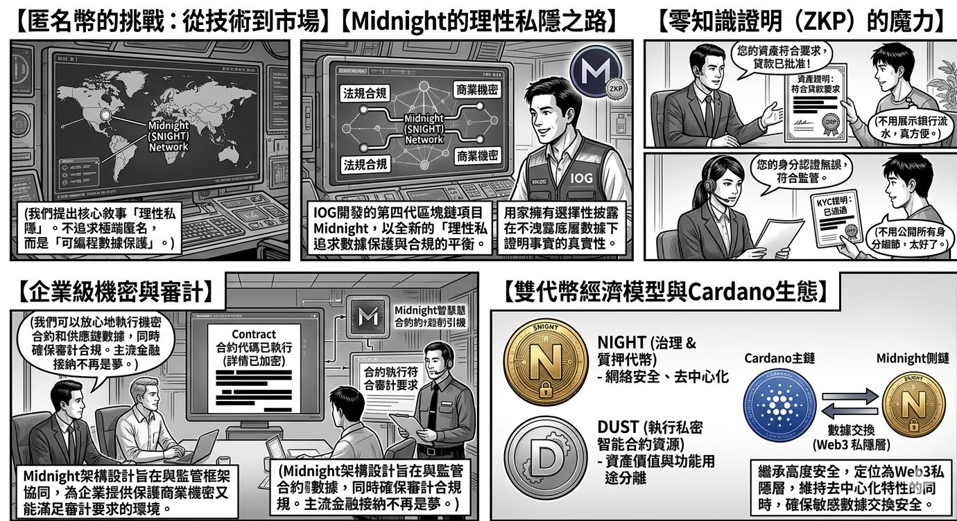 NIGHT的出現正好填補了加密市場長期以來透明度過高與之私隱幣的非法性之間的巨大鴻溝。它讓開發者能夠構建新型的「混合型 DApps」(Hybrid DApps),這類應用在前端保持去中心化與透明,但在處理個人身份、醫療數據或機密商業決策時,則自動進入 Midnight 的保護層。