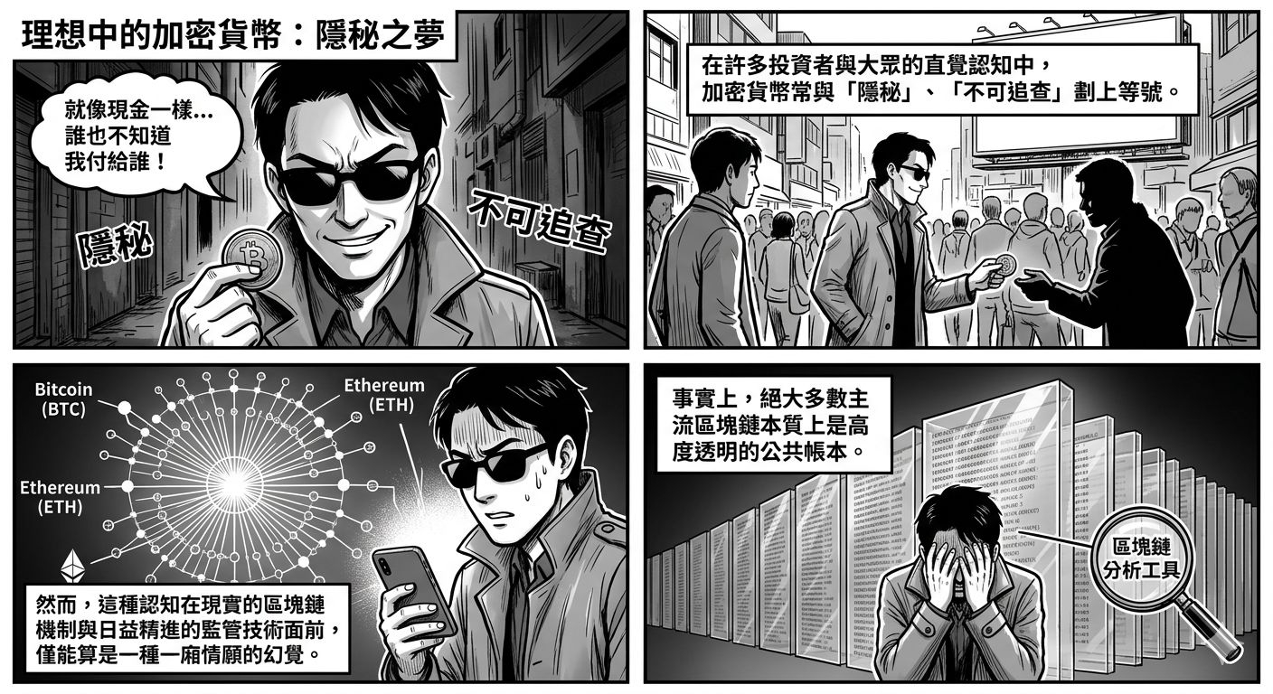 在許多投資者與大眾的直覺認知中,加密貨幣常與「隱秘」、「不可追查」劃上等號。然而,這種認知在現實的區塊鏈機制與日益精進的監管技術面前,僅能算是一種一廂情願的幻覺。事實上,絕大多數主流區塊鏈(如 Bitcoin 與 Ethereum)本質上是高度透明的公共帳本。