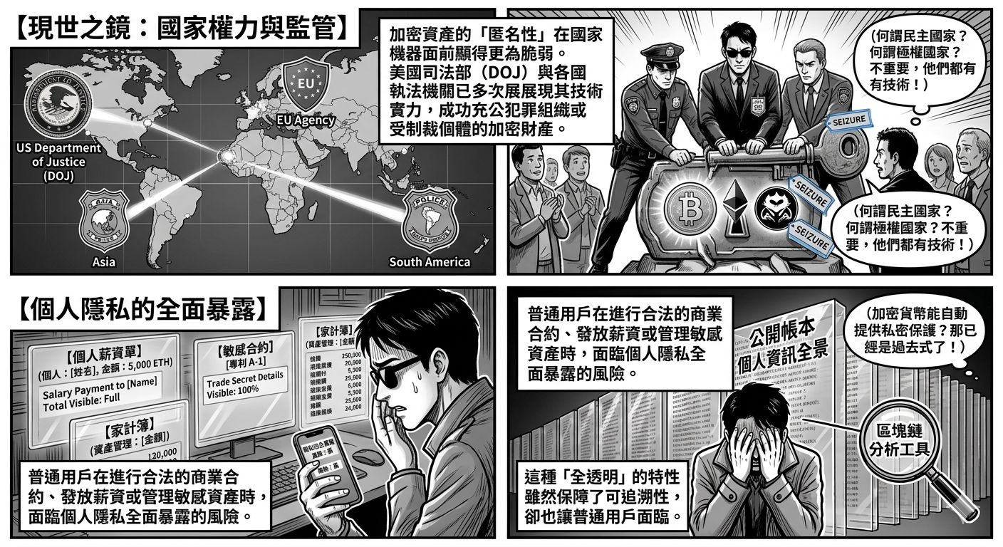 更進一步,加密資產的「匿名性」在國家機器面前顯得更為脆弱。美國司法部(DOJ)與各國執法機關已多次展現其技術實力(何謂民主國家?何謂極權國家?),成功充公犯罪組織或受制裁個體的加密財產。這種「全透明」的特性雖然保障了可追溯性,卻也讓普通用戶在進行合法的商業合約、發放薪資或管理敏感資產時,面臨個人隱私全面暴露的風險。以往認為加密貨幣能自動提供私密保護的觀念,顯然已跟不上當前的現實環境。