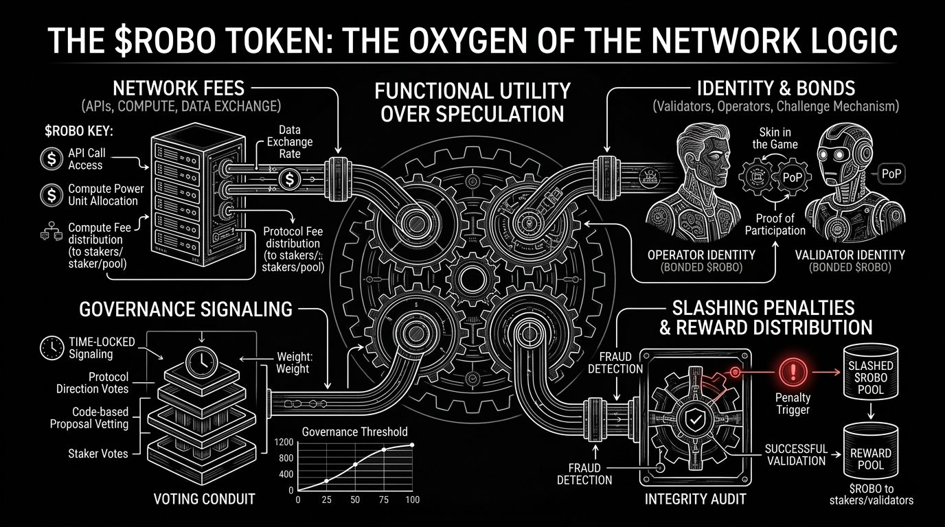 But let’s talk business, Why does the $ROBO token actually matter to someone with a portfolio to protect? Most tokens are just community badges but $ROBO is the oxygen of the Fabric Foundation ecosystem. It is hard coded into the logic. You need $ROBO for network fees API interactions and data exchange and more importantly it powers the Bonded Roles. If you want to be a validator or an operator within Fabric you have to put your capital at risk through $ROBO bonds and time-locked signaling. If you cheat you get slashed it is a skin in the game model where $ROBO forces participants to be honest because fraud becomes economically unattractive.