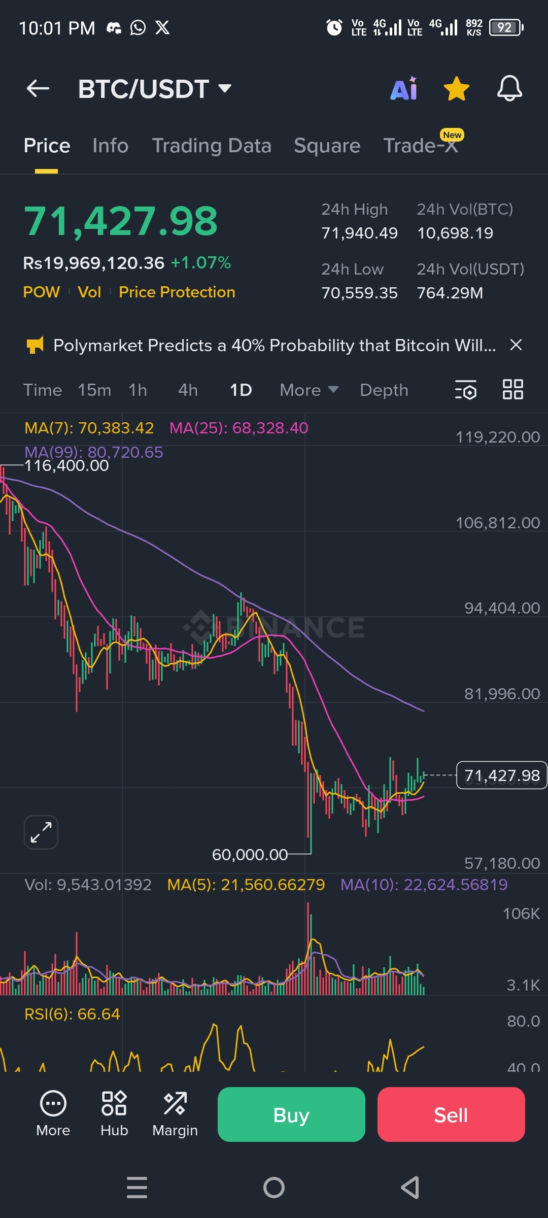 The chart shows Bitcoin (BTC) trading at approximately $71,427.98. Key technical elements to observe include: