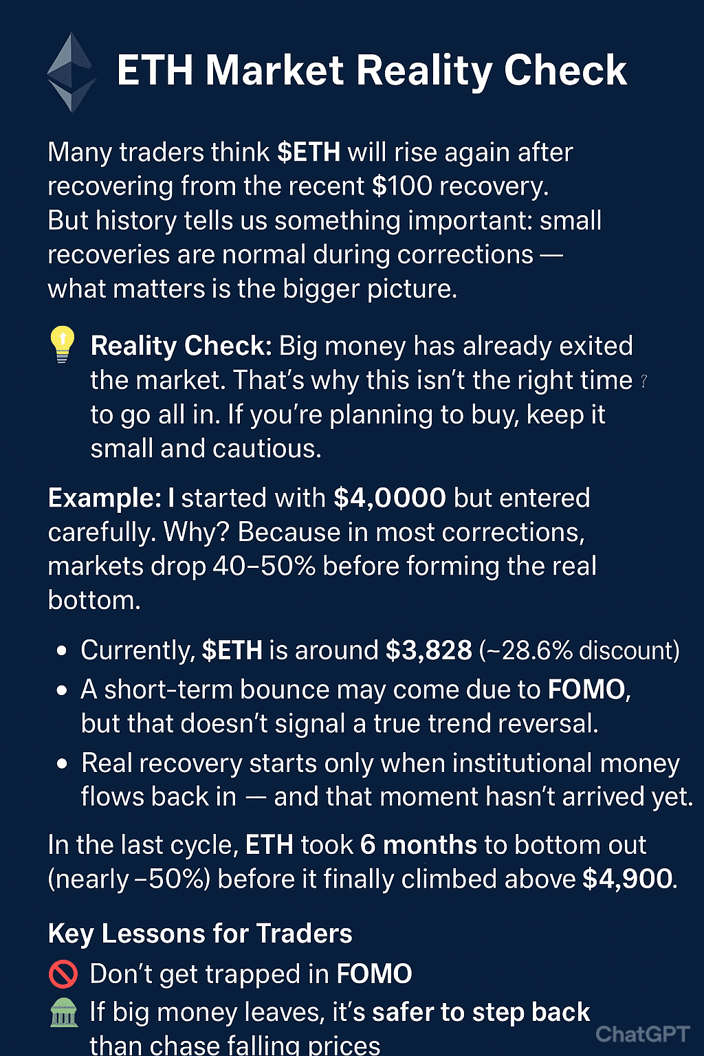 📉 În ultimul ciclu, ETH a durat 6 luni pentru a atinge minimul (aproape –50%) înainte de a urca în cele din urmă peste 4.900 $.