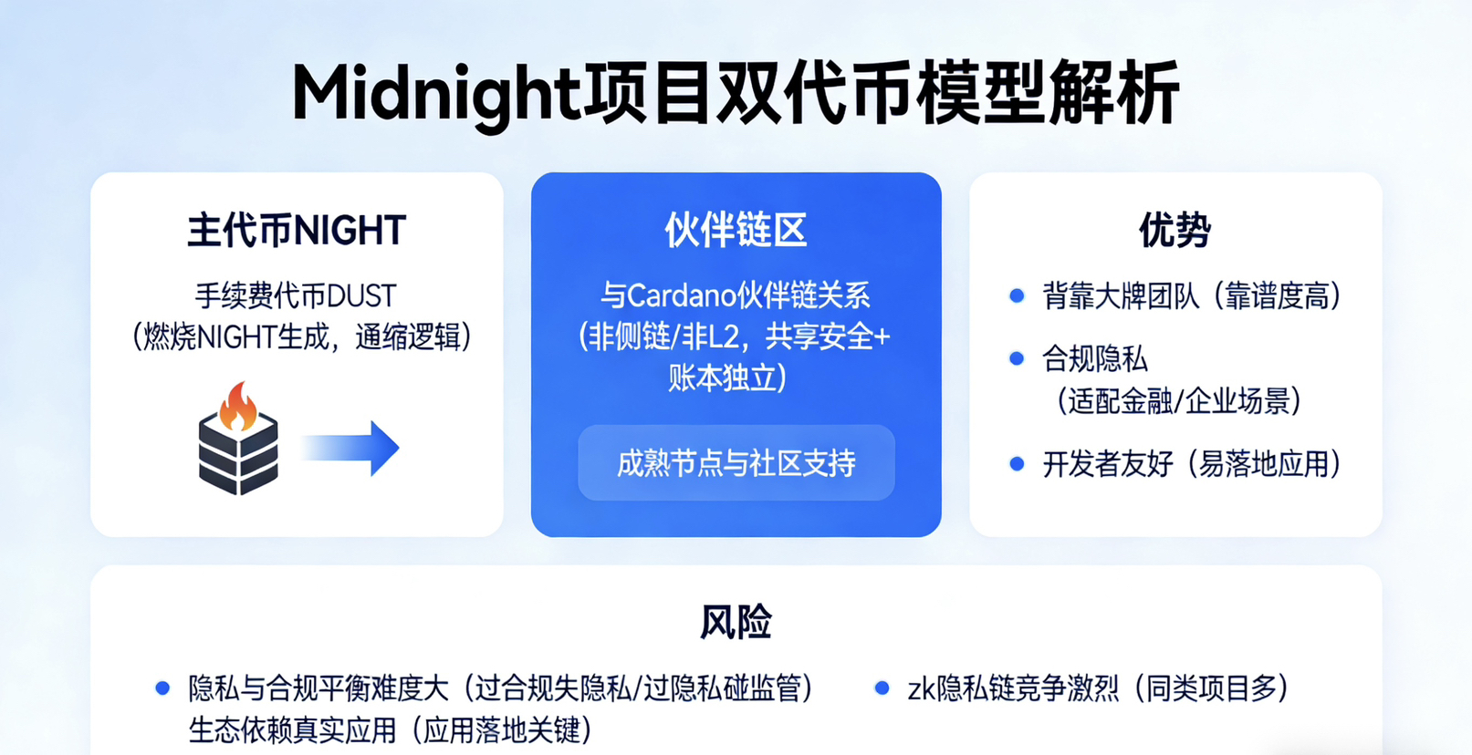 Aspectul token-urilor este model dual: $NIGHT token principal, DUST ca taxă de tranzacție, DUST trebuie să fie generat prin arderea NIGHT, ceea ce echivalează cu o logică de deflație încorporată.