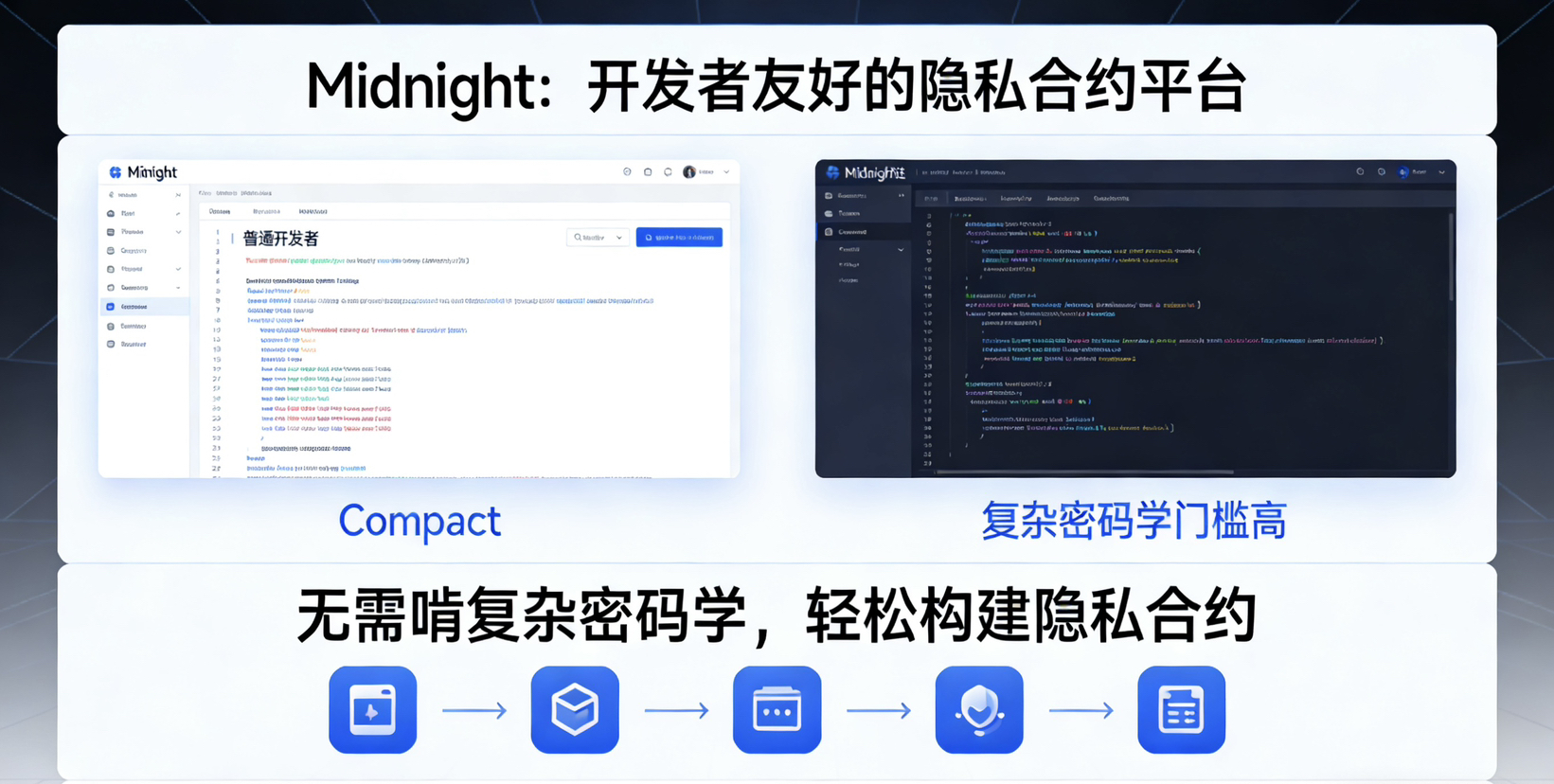 Midnight folosește propriul său limbaj Compact, prietenos pentru dezvoltatorii obișnuiți, care nu necesită criptografie complexă pentru a scrie contracte de confidențialitate.