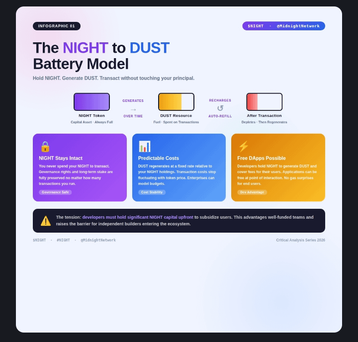 At the heart sits $NIGHT — the unshielded native governance and utility token (24 billion total supply). It secures the chain, powers proposals and voting, and automatically generates DUST — a shielded, renewable, non-transferable “privacy battery.”DUST regenerates from your $NIGHT holdings and pays for every private transaction and smart-contract execution — without ever touching your principal stake. This dual-token model keeps $NIGHT fully auditable and exchange-friendly while DUST handles confidential operations perfectly.