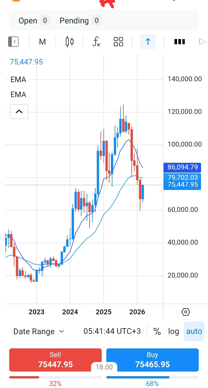 Late 2025 to now (March 2026): Sharp reversal with a series of red (down) candles. Price has broken below the blue EMA, entering correction territory. Current levels are testing around 75,000-75,400 (with recent trades fluctuating between ~74,600 and ~76,000 as of March 17, 2026, around 05:50 AM +03).