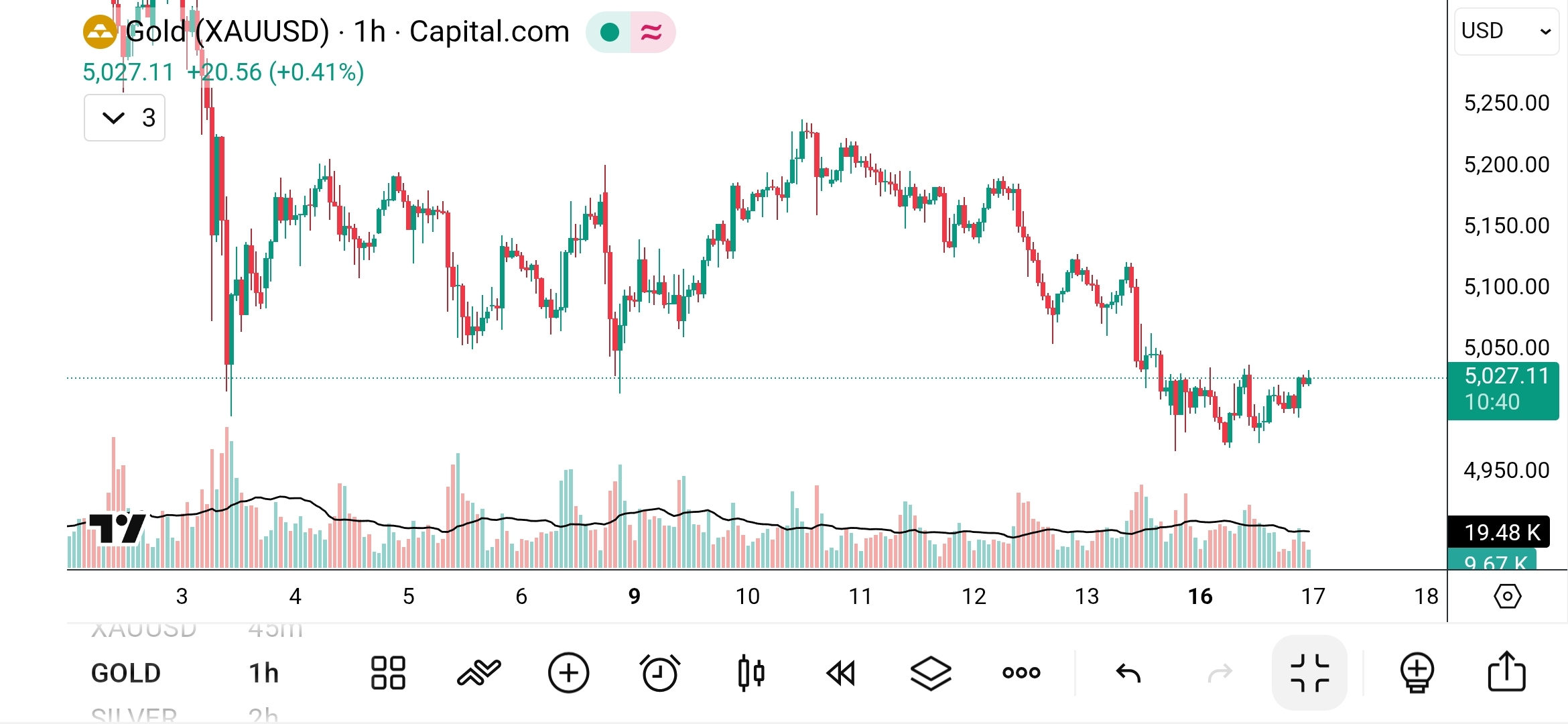 The recent price movement around $5,027 suggests the market is now consolidating near support after a rapid decline.