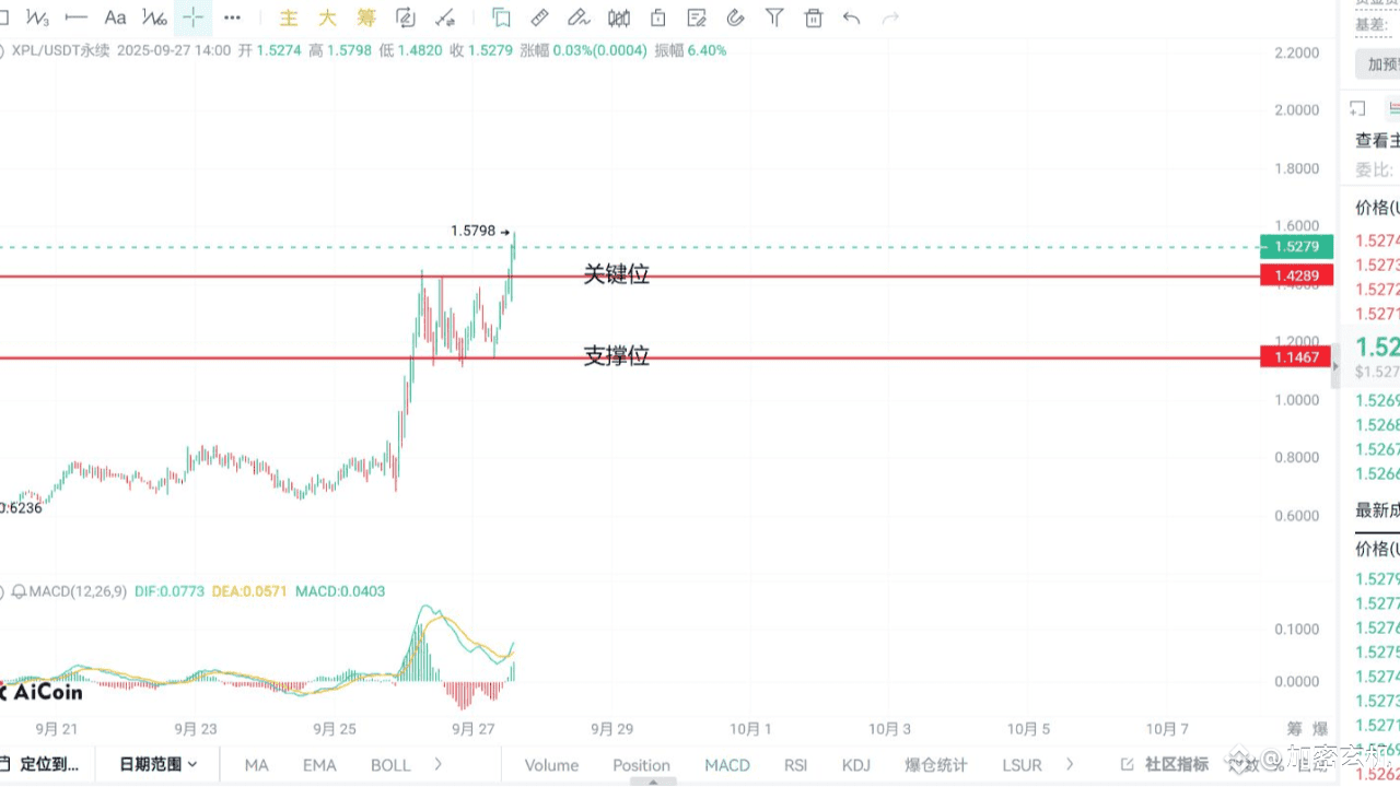 Operațiuni XPL: prețul curent în jur de 1.528, investitorii agresivi pot încerca să cumpere cu o cantitate mică, stop-loss setat sub 1.4289, obiectivul vizat 1.6000. Investitorii conservatori sunt sfătuiți să aștepte, să observe o ruptură de volum peste 1.6000 înainte de a intra, pentru a evita o ruptură falsă.
