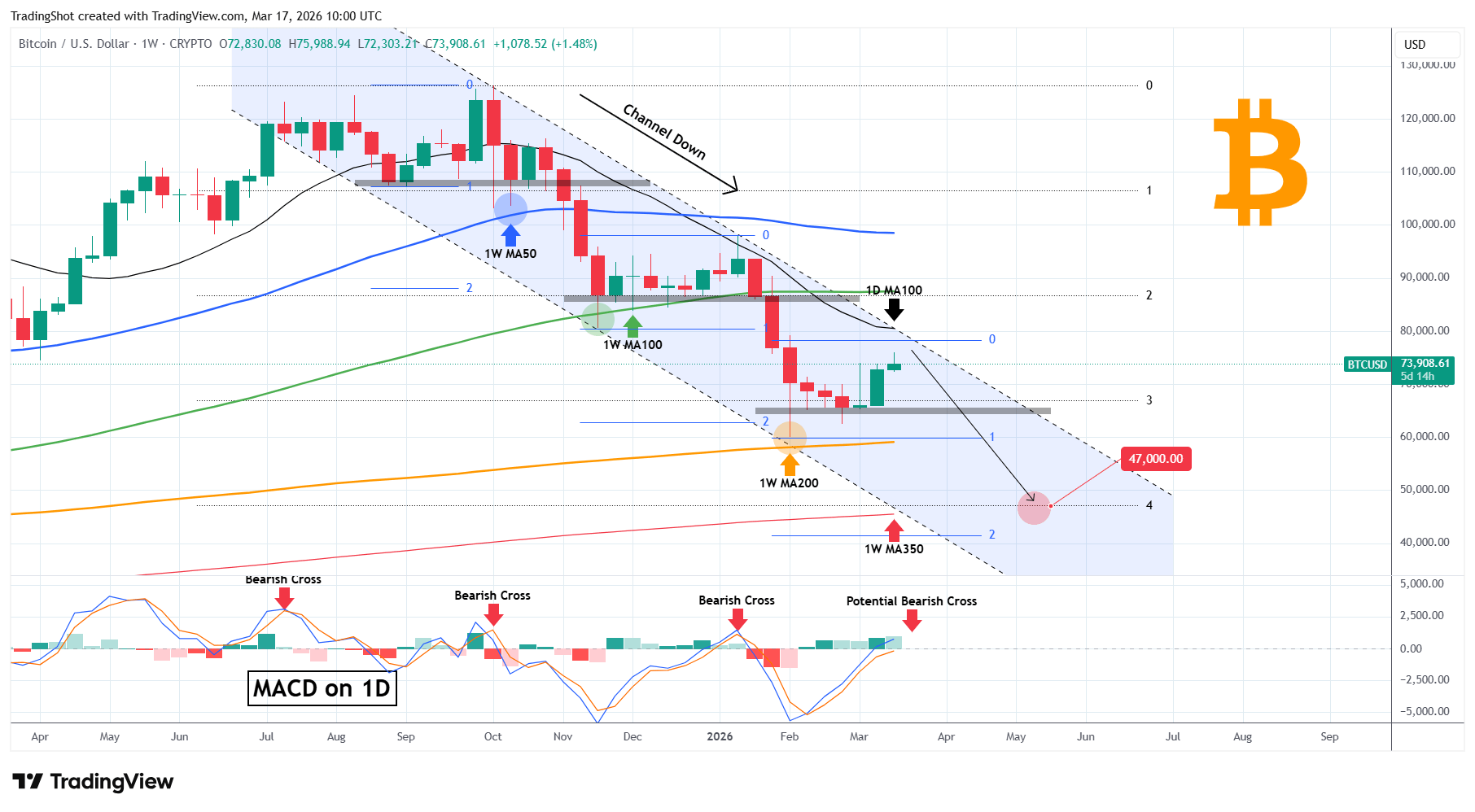 În același timp, fiecare minim inferior a atins extensia Fibonacci de 2.0 din faza de consolidare, care acum se află la 41500 $. În mod efectiv, acest lucru creează o zonă țintă de 47000 - 41500. Observați de asemenea că MA100 pe 1D (linia de tendință neagră) a fost rezistența cu multiple respingeri de preț din 13 octombrie 2025. De asemenea, cel mai eficient semnal de vânzare din acest model a fost MACD pe 1D făcând o încrucișare bearish.