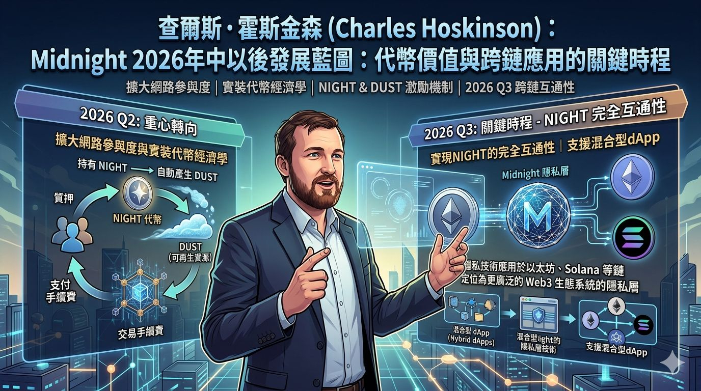 Charles Hoskinson特別提到Midnight 2026年中以後的發展藍圖非常關鍵,特別在於如何處理代幣價值與進行跨鏈應用。