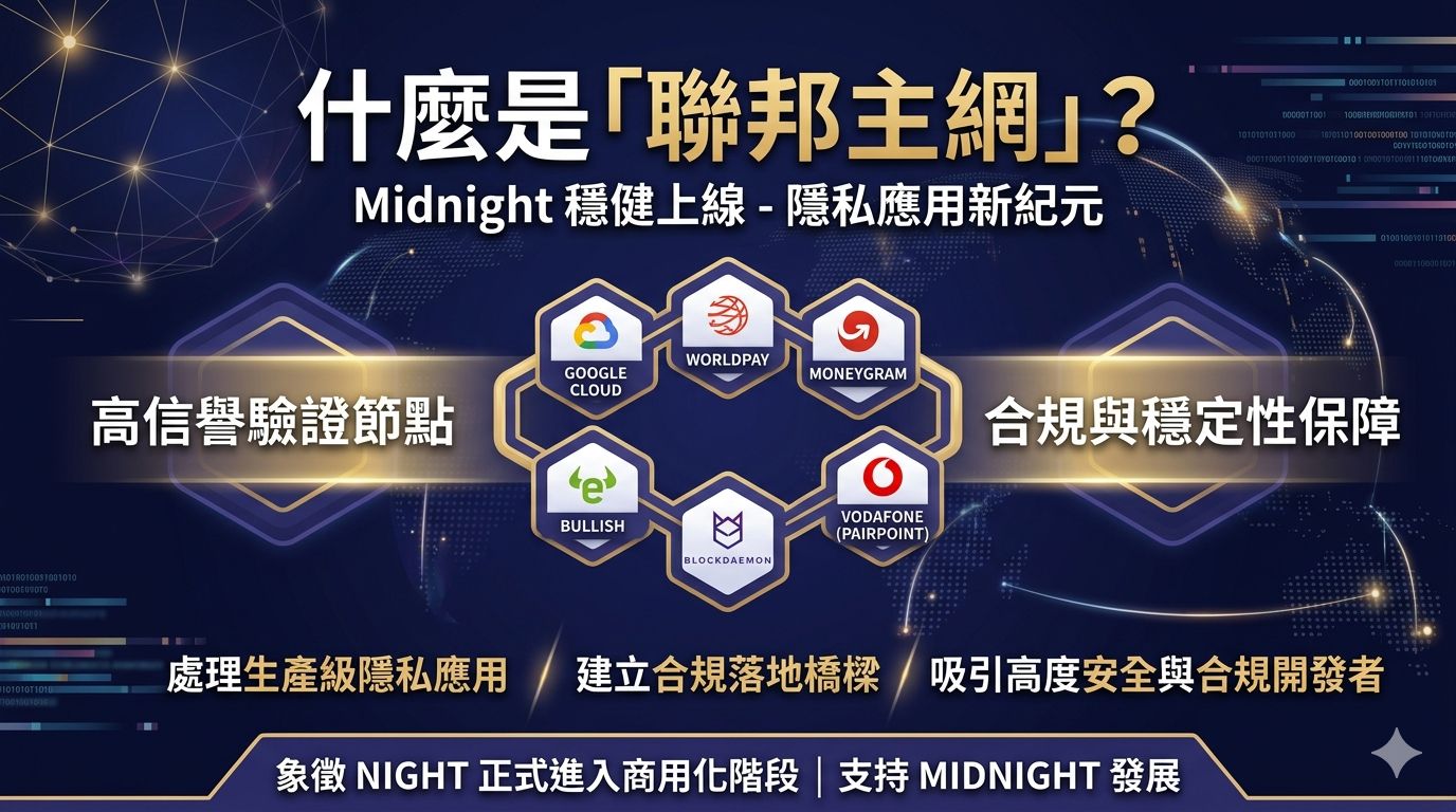 為了確保上線初期的穩定性與合規性,Midnight 採取了穩健的「聯邦主網」(Federated Mainnet)模式。這不是一般的去中心化公鏈,而是由少數具備信譽極高的行業巨頭直接坐鎮,擔任驗證節點並維護網絡安全。