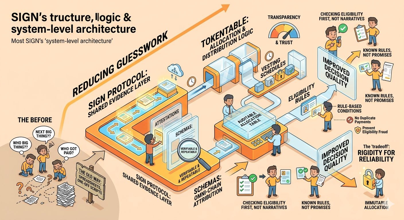Seen from that angle, SIGN starts to look less like a single token story and more like an attempt to reduce the amount of guesswork people have to tolerate. The official framing is not just “credential verification” or “token distribution” in the abstract. Binance’s project summary describes Sign as global infrastructure for credential verification and token distribution, while the project’s own documentation frames S.I.G.N. as a system-level architecture for money, identity, and capital, with Sign Protocol acting as a shared evidence layer and TokenTable handling allocation and distribution logic. That matters because it suggests the project is trying to sit underneath behavior, not above it. It is aimed at the point where users ask, “Who said this is valid?” and “Why did this wallet get paid?” rather than at the point where they are already celebrating the outcome.