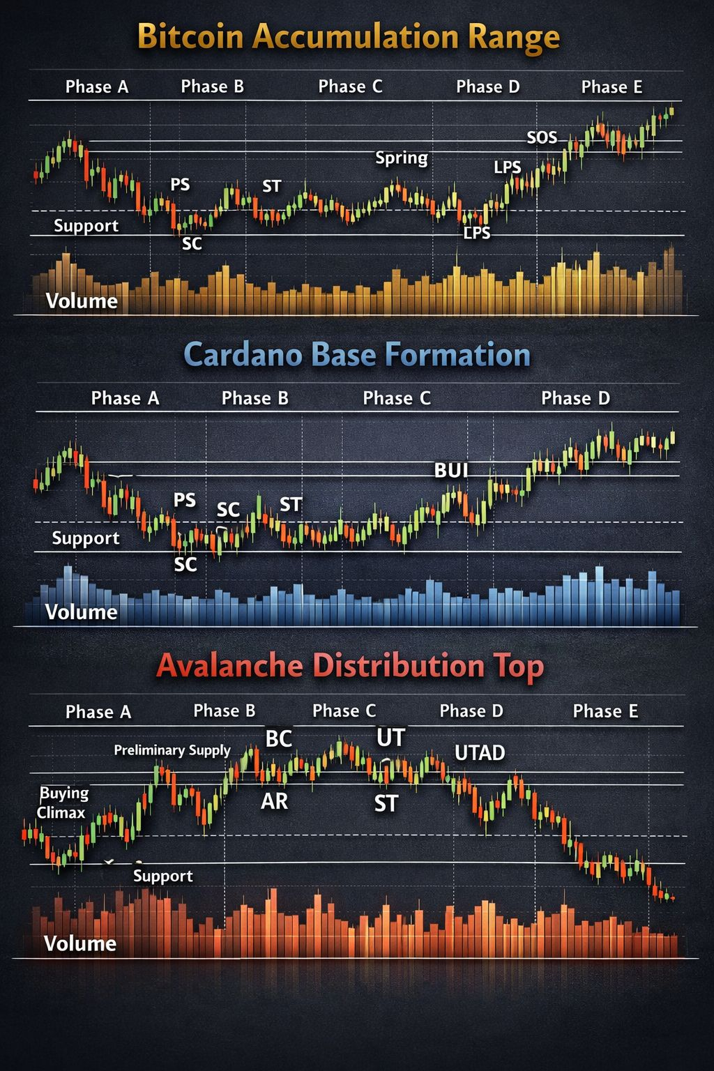 Store-of-value leaders like $BTC accumulate quietly before expansion. Smart contract platforms like $ADA build bases before trend continuation. High-throughput chains like $AVAX distribute near euphoric peaks.
