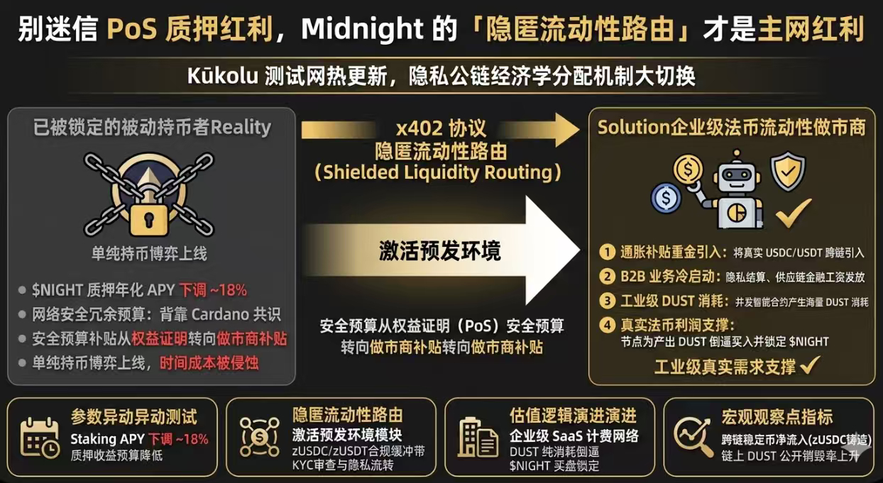 如果一个网络里只有高波动的 $NIGHT,企业是无法进行供应链结算和工资发放的。因此,协议必须调整其通胀预算的流向。降低基础质押的 APY,是为了腾出代币排放的空间,去重金补贴那些愿意将真实 USDC/USDT 跨链引入隐私网络的流动性提供者(LPs)。这标志着网络从“关注自身安全”向“关注业务拓展”的成熟期过渡。