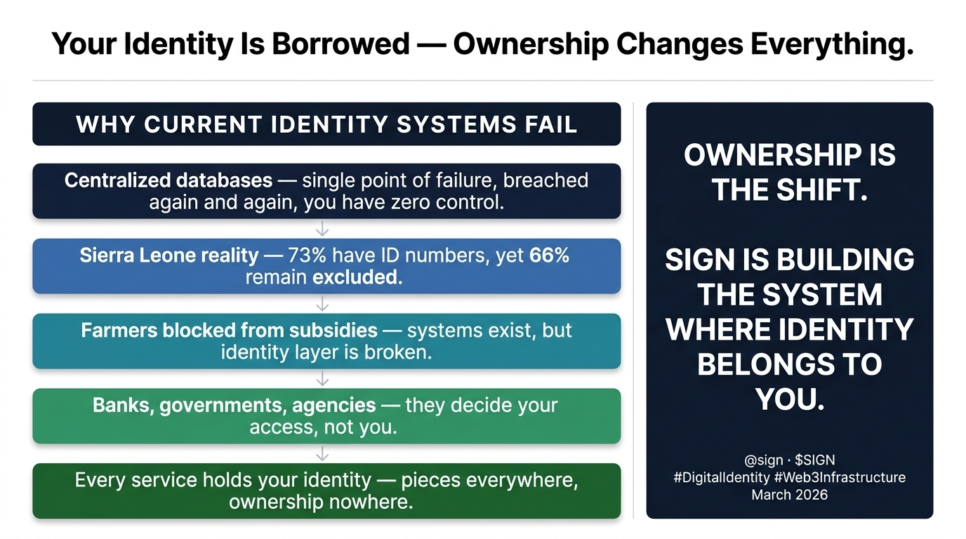Acesta este sistemul care există chiar acum. Și nu este o inconveniență minoră. În Sierra Leone, 73% dintre cetățeni au numere de identitate. Doar 5% dețin cărți de identitate reale. Rezultatul — 66% excluziune financiară. Nu pentru că banii nu sunt acolo. Nu pentru că băncile nu sunt acolo. Ci pentru că stratul de identitate care conectează un ființă umană la un sistem financiar pur și simplu nu funcționează la scară.
