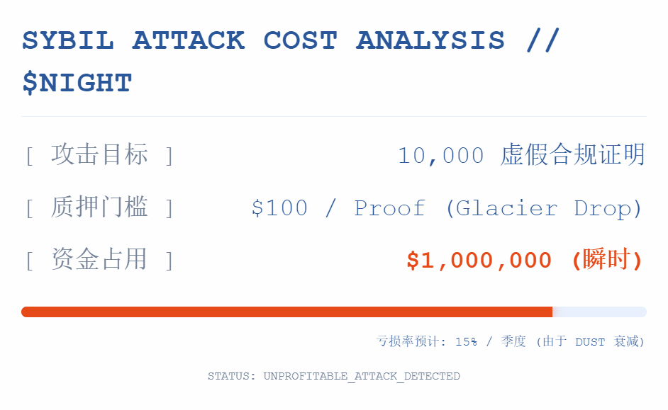博弈账:数据伪造与攻击成本。 在 Midnight 的生态中,如果一个黑产机构想要通过 Sybil 攻击(女巫攻击)来大规模伪造合规证明以污染信用池,他们必须通过 Glacier Drop 或类似机制持有并消耗 DUST。假设每笔合规证明的质押门槛是 100 美元,当攻击者试图模拟 10,000 个虚假身份时,其瞬时资金占用将达到 100 万美元。由于 DUST 具备动态代谢属性,这些资金在攻击周期内的机会成本和折损率将导致攻击者的亏损率每季度递增约 15%。这种基于“沉没成本”的物理防御,让恶意博弈变得入不敷出。