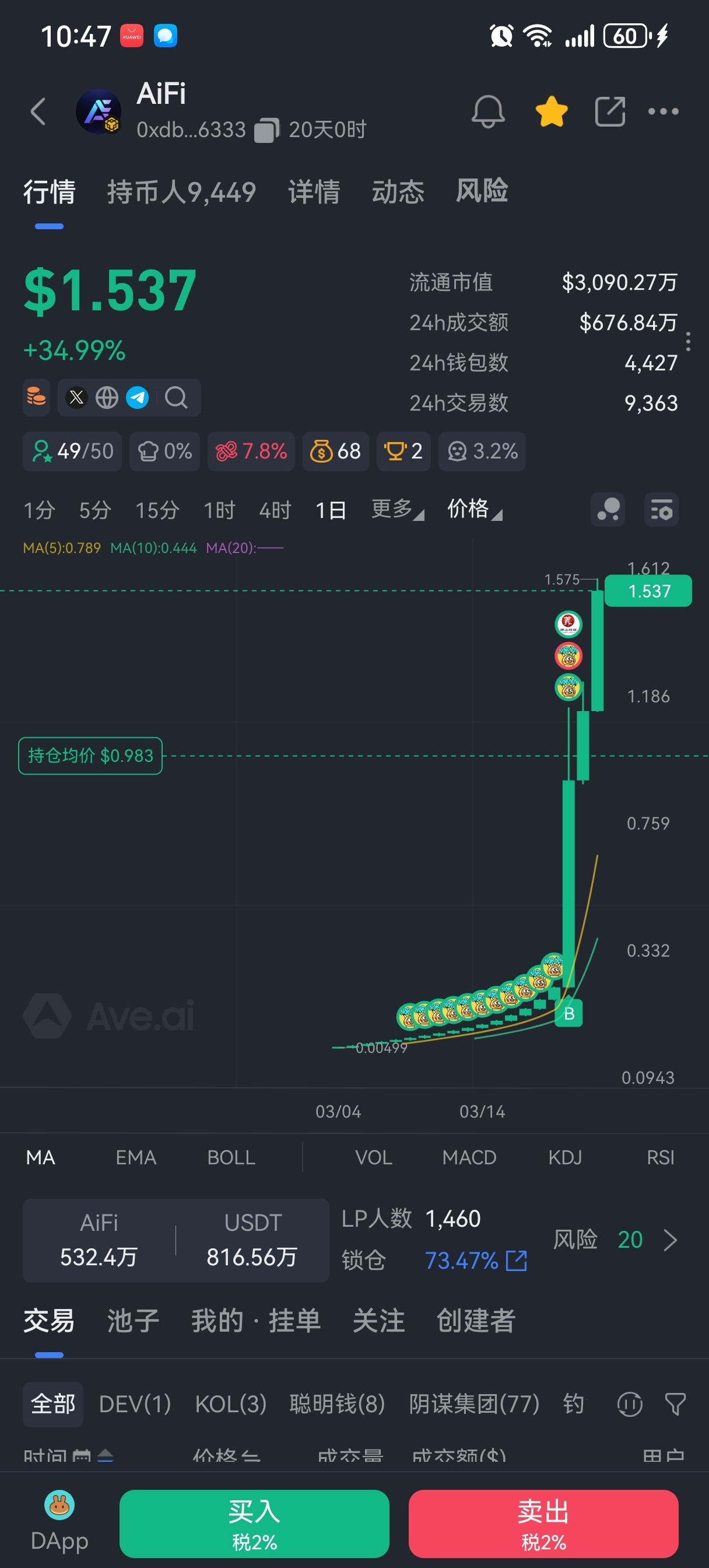 24h成交额近700万,钱包数4427,交易数9363,每一个数据都在说明:AiFi已经成为市场焦点,聪明钱已经提前布局,现在就是散户上车的黄金窗口。