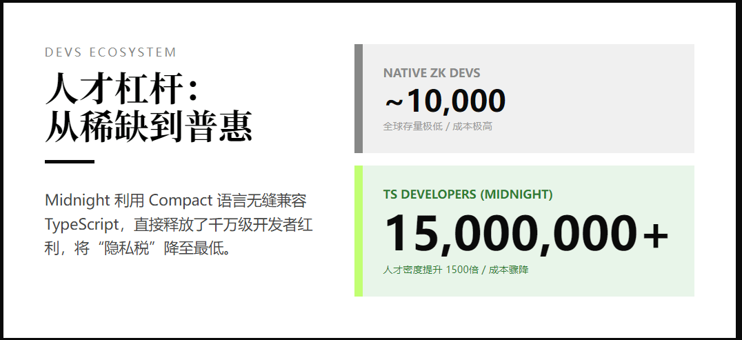 大众红利: Midnight 释放了全球 1500 万 TS 开发者的生产力,让企业无需支付天价“专家溢价”即可部署隐私应用。