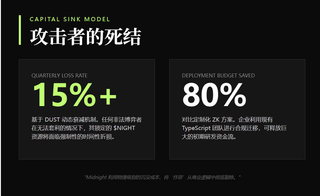 博弈账:信用污染的沉没成本。 在 Midnight 架构下,任何试图通过伪造供应链发票(Sybil 攻击)来套利的恶意节点,必须面对 DUST(容量资源) 的硬性开支。假设攻击者需要维持 1000 个虚假合规证明,按 100 刀/节点的资源锁定计算,其季度资金占用成本极高。由于 DUST 的动态衰减属性,若攻击者无法在短时间内完成套利诈骗,其资本亏损率每季度将高达 15% 以上。这种物理级别的财务阻尼,让欺诈博弈变成了入不敷出的自杀行为。